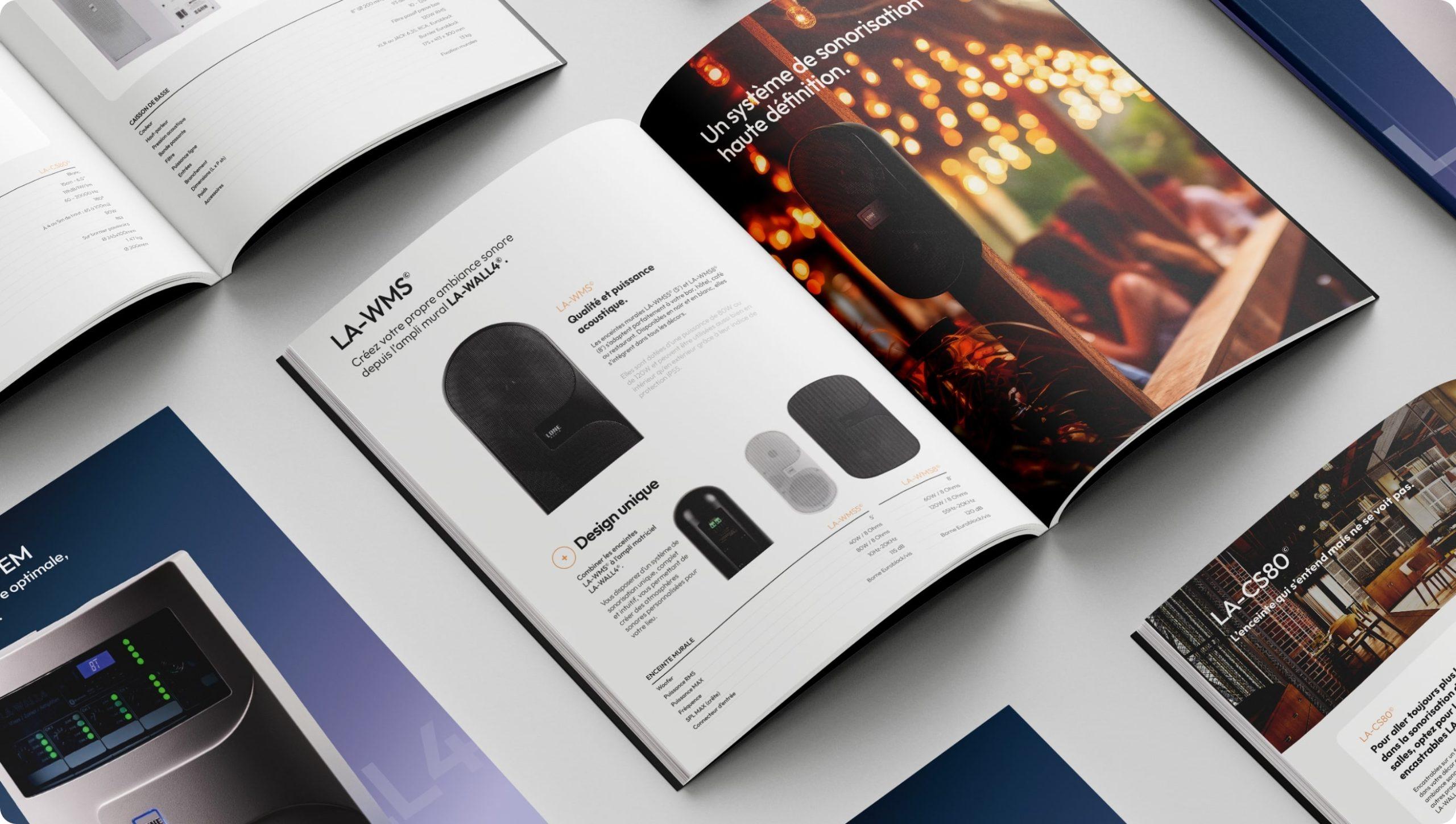Pour promouvoir un produit, quoi de mieux que d’aller à l’essentiel, au cœur du son. Pour accompagner la création de sa nouvelle gamme de catalogue, nous avons mené un travail de fond autour des systèmes Rondson pour sublimer leurs lignes et souligner leur technicité. En résulte un univers minimaliste qui s’illustre au fil de catalogues avec la rigueur d’une partition musicale.